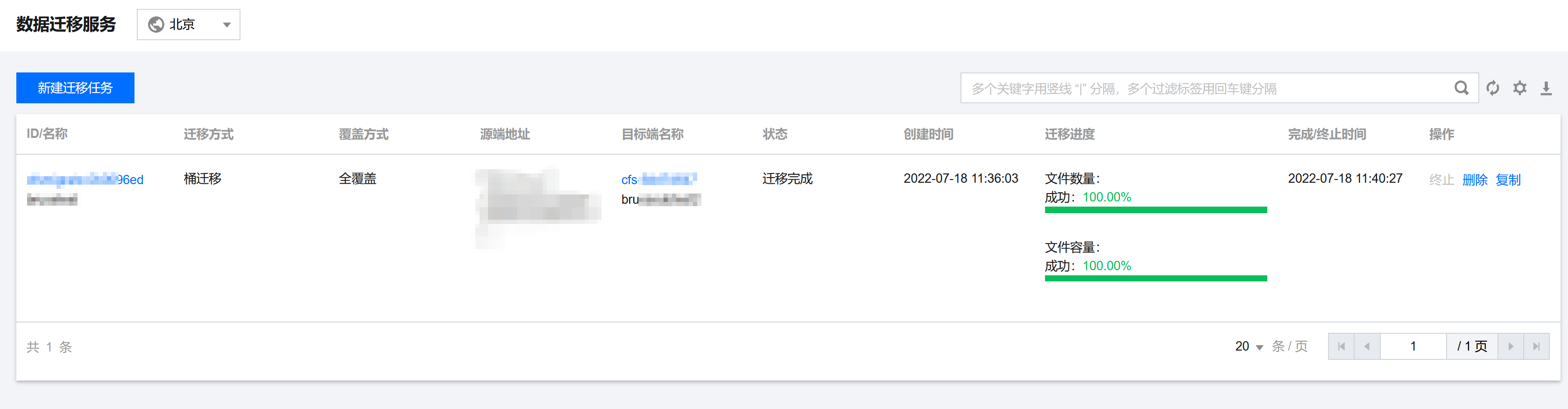 页面,您可选择对应地域,查看基本的迁移任务信息,如迁移设置、进度等。