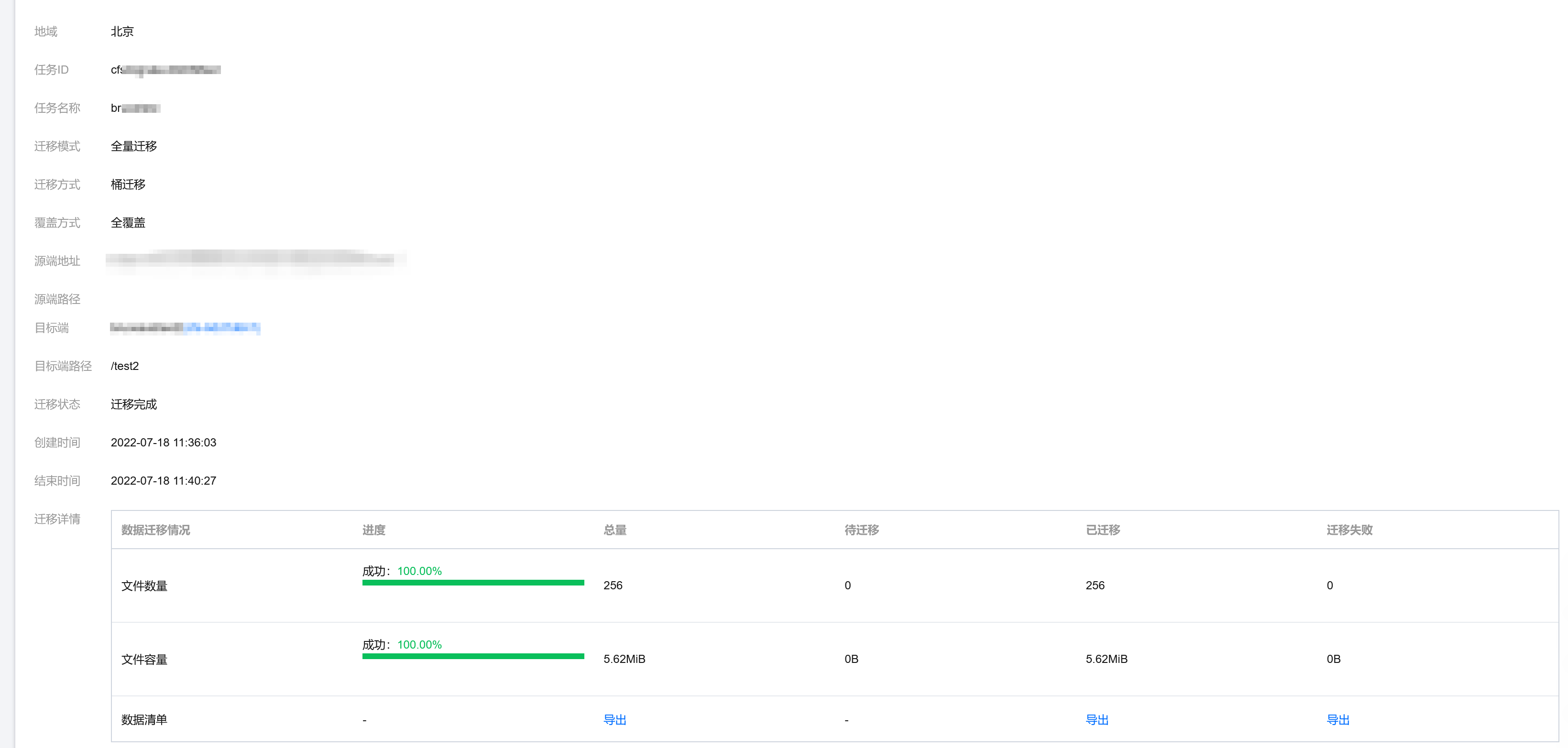 页面,单击迁移任务的 ID/名称,即可查询详细的迁移信息,如迁移总文件数量/容量、待迁移文件数量/容量、已迁移文件数量/容量、迁移失败文件数量/容量。