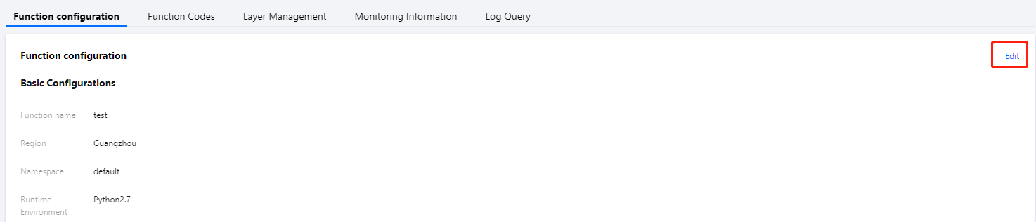 3. 在“函数配置”页面,单击右上角的编辑。如下图所示: