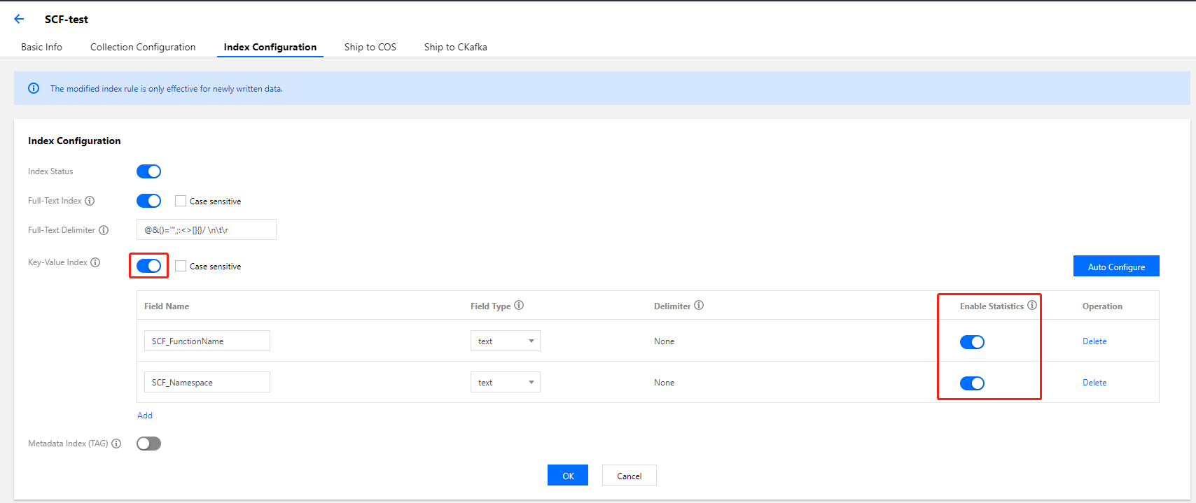 对于配置了日志服务的函数,为保证云函数控制台日志展示效果,请在键值索引配置中为字段打开“开启统计”能力。如下图所示: