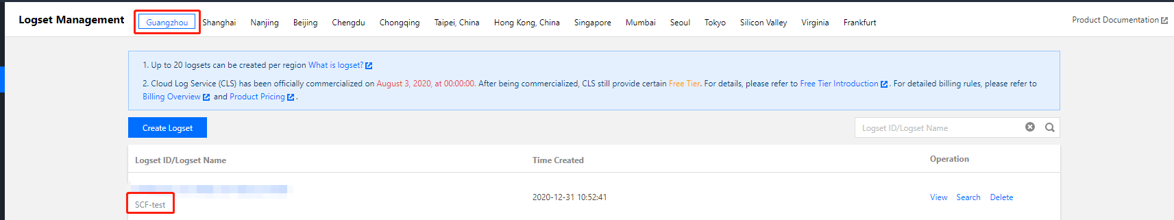 日志集地域请选择函数服务所在地域,暂不支持跨地域日志推送。