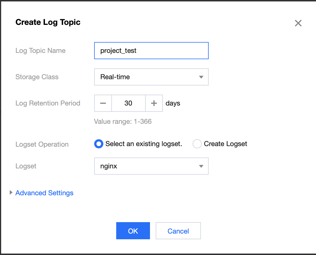 3. 单击创建日志主题,在弹出的创建日志集窗口中,填写相关信息: