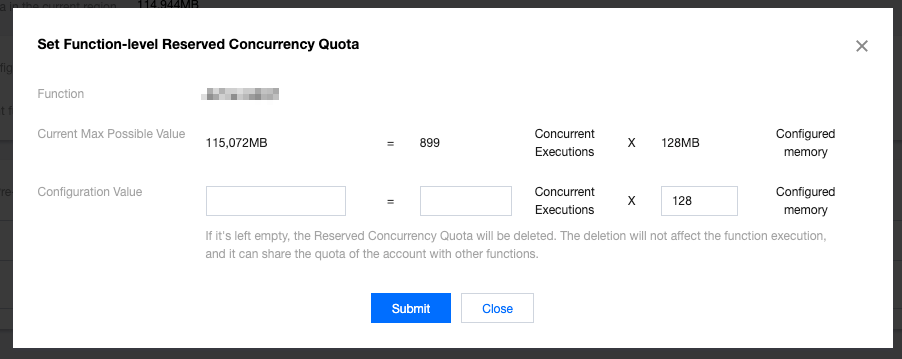 4. 在弹出的“设置函数最大独占配额”窗口中,设置期望的最大独占配额,单击提交即可。如下图所示: