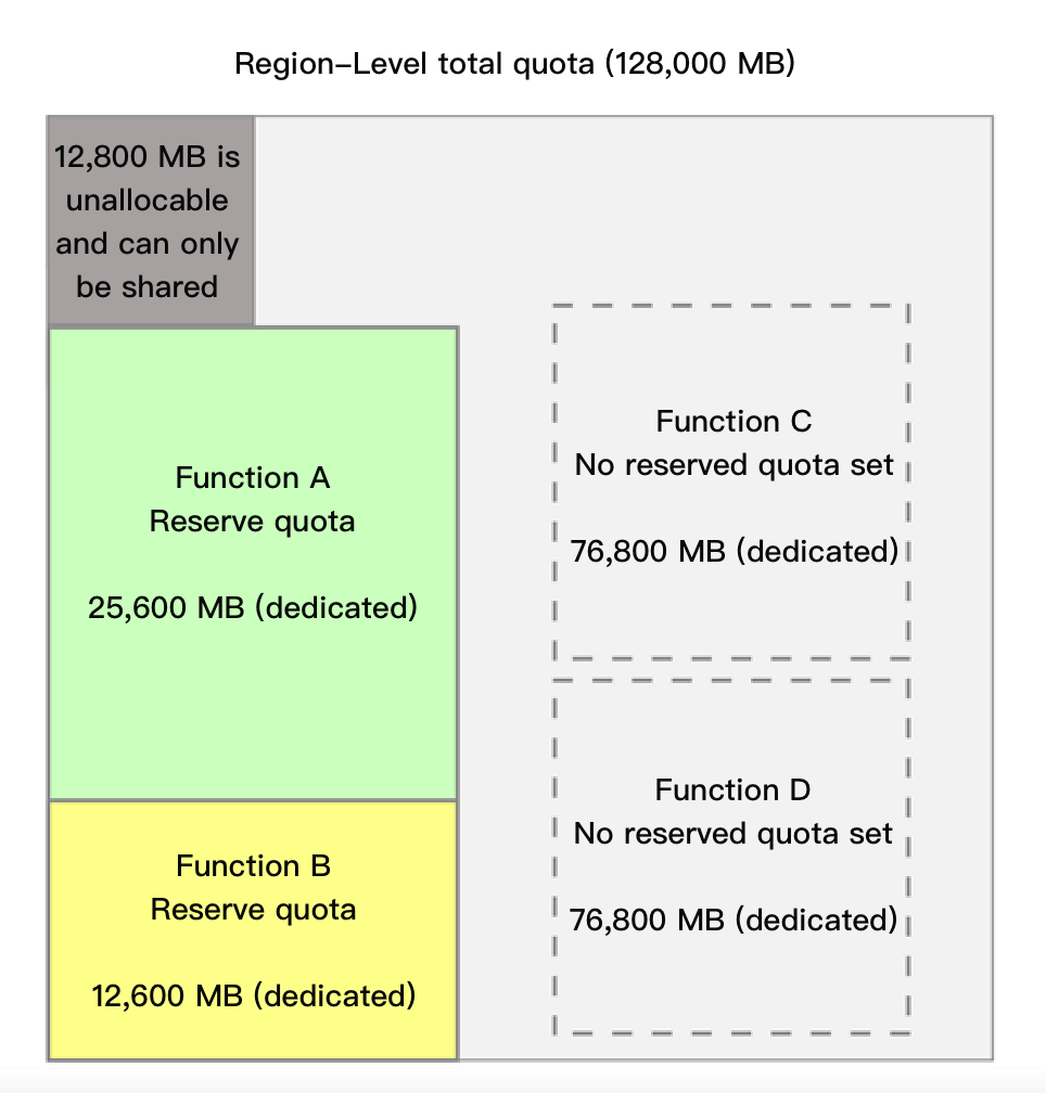 每个账号在地域维度有总并发额度限制,默认为 128,000 MB 或 64,000MB,详情可参见 配额限制。地域间的并发额度相互独立,彼此不受影响。 默认情况下,一个地域下的所有函数共享账号级并发额度,即在某一具体时刻,所有函数处于运行状态的实际并发额之和,最大可以达到账号并发额度。超出并发额度的请求将遇到超限错误(432 ResourceLimitReached),可以通过 购买套餐包 来进一步提升账号配额。 您可以使用函数的 最大独占配额能力,将地域维度并发分配至某个函数上,从而实现对函数的并发进行管理。为了避免账号级额度全部分配后,未设置最大独占配额的函数无法调用,云函数平台将 12,800MB 的账号级并发额度限制为不可分配、仅供未配置保留的函数使用。如下图所示: