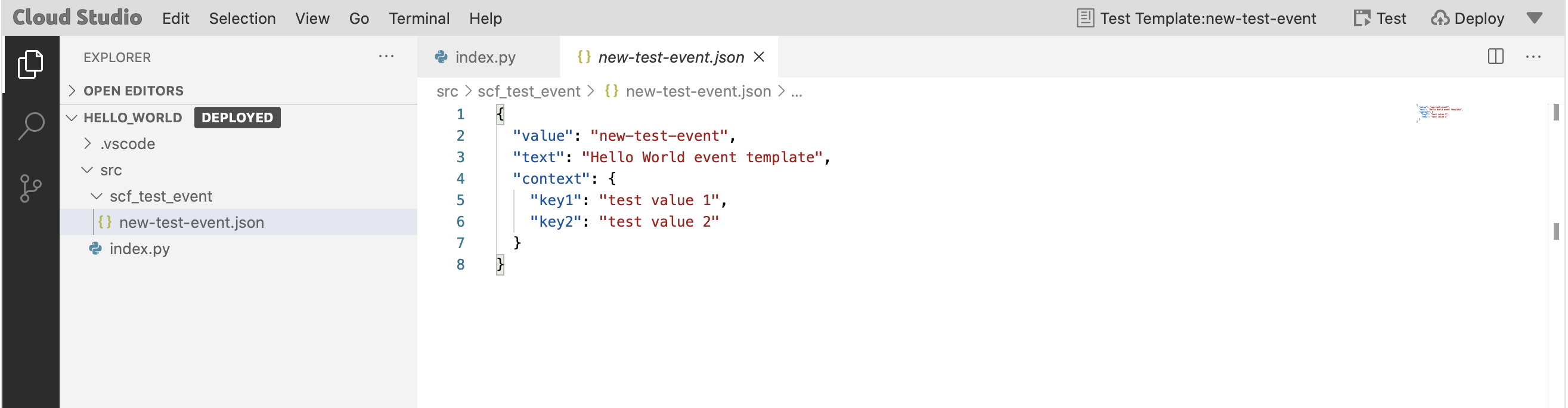 新增测试模板:如果现有的测试模板不能满足您的测试需求,可以在测试模板下拉列表中选择新增测试模板自定义测试事件,新增测试事件将以 JSON 文件的格式存储在函数根目录 /src 下的 scf_test_event 文件夹中,跟随函数一起部署到云端。如下图所示: