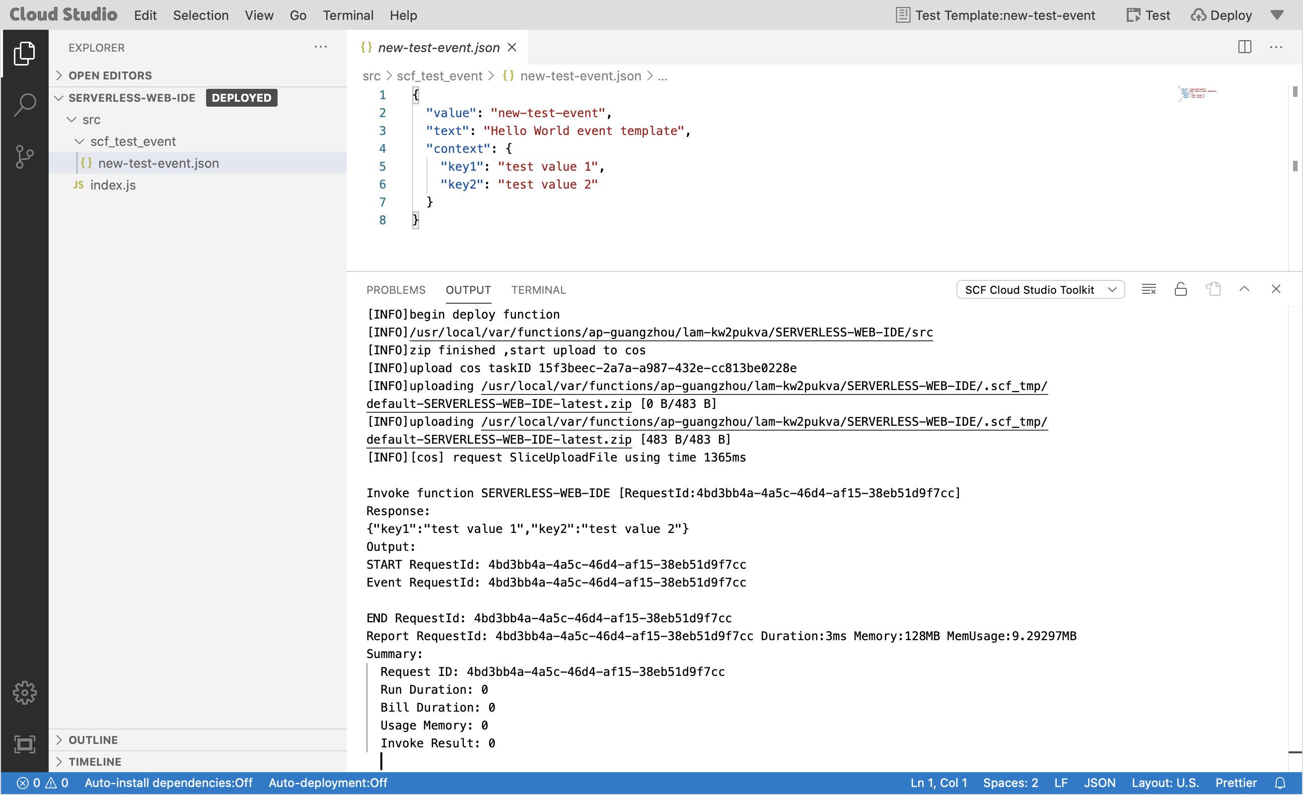 自动部署:自动部署模式下,保存(ctrl + s 或 command + s)即可触发函数部署到云端。
