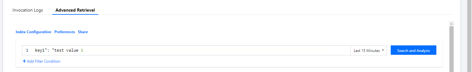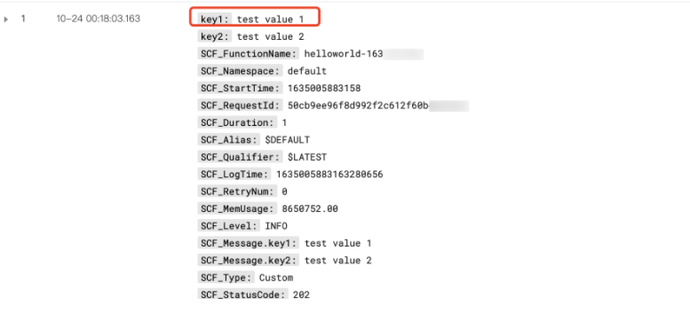 SCF_CustomKey:SCF,请参考 日志服务索引配置 为函数日志投递的日志主题添加键值索引。SCF_LogTopic_ 为前缀命名)不支持修改索引配置。请将函数日志投递主题设置为 自定义投递 后再更新日志主题索引配置。字段:值的方式进行投递。JSON 内容的解析仅能解析第一层的值类型为数值和文本类型的字段:值,其他类型的将被忽略。# -*- coding: utf8 -*-import jsondef main_handler(event, context):print(json.dumps({"key1": "test value 1","key2": "test value 2"}))return("Hello World!")