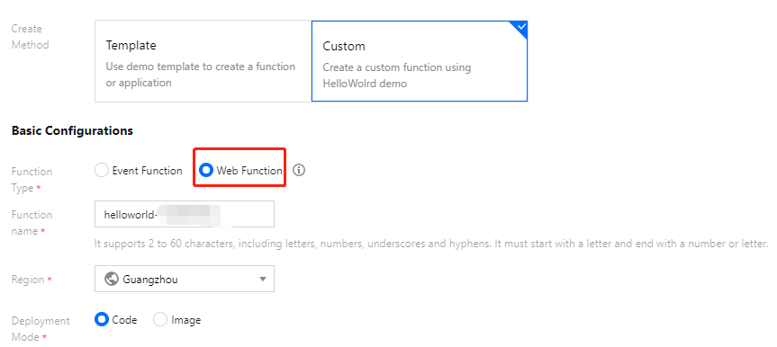 3. 选择使用自定义创建来新建函数,并填写函数基础配置,如下图所示: