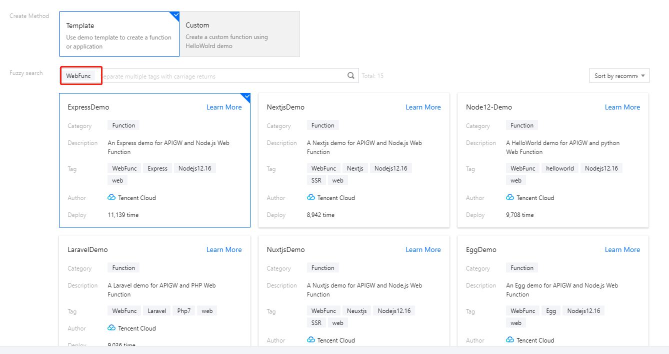 3. 选择使用模版创建来新建函数,在搜索框里筛选 WebFunc,筛选所有 Web 函数模版,选择您想使用的模版,点击“下一步”。如下图所示: