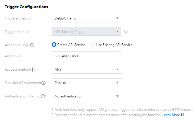 启动命令:对于 Web 函数,您必须为您的项目配置 scf_bootstrap 启动文件,保证 Web Server 在函数环境中可以正常启动。您可以选择 SCF 为您提供的默认框架模版,也可以使用自定义模版,编写您自己的启动命令。详情可参见 启动文件说明。 5. 在"触发器配置"中,触发器目前只支持 API 网关触发,将自动按照默认配置创建触发器。