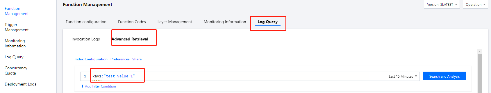 在使用上述代码进行测试运行后,您可在函数-日志查询-高级检索中通过如下语句进行检索:
