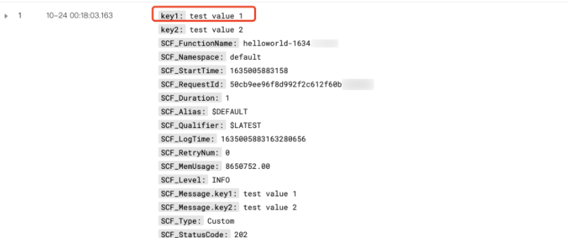 在测试写入日志服务后,您可以在日志查询中检索到 key1 字段。如下图所示: