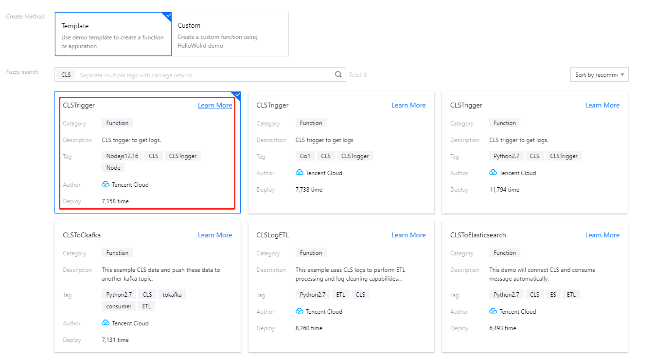 此处以 CLS 示例模版为例,创建函数项目,模版默认创建流程中,直接配置触发器。在实际创建过程中,您也可以创建完成后再进行配置,此处以创建完成后配置触发器为例进行说明: