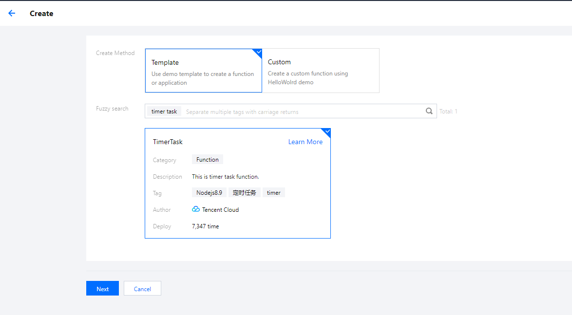 此处以定时事件示例模版为例,创建函数项目,模版默认创建流程中,直接配置触发器,实际创建中,您也可以创建完成后再进行配置,此处以创建完成后配置为例进行说明: