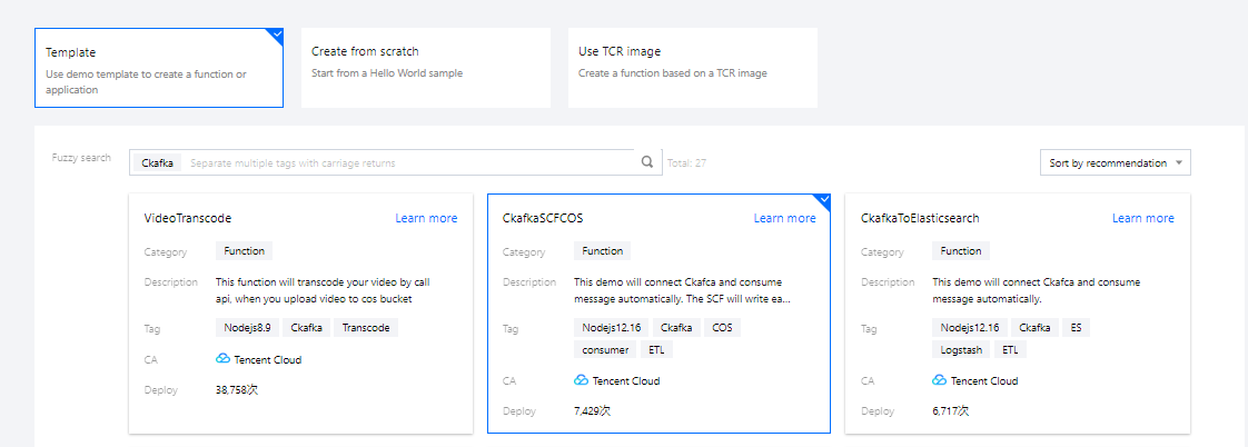 2. 在新建函数页面,选择使用模板创建来新建函数,在搜索框里筛选Ckafka,选择 “Ckafka 消息转储至 COS”。如下图所示: