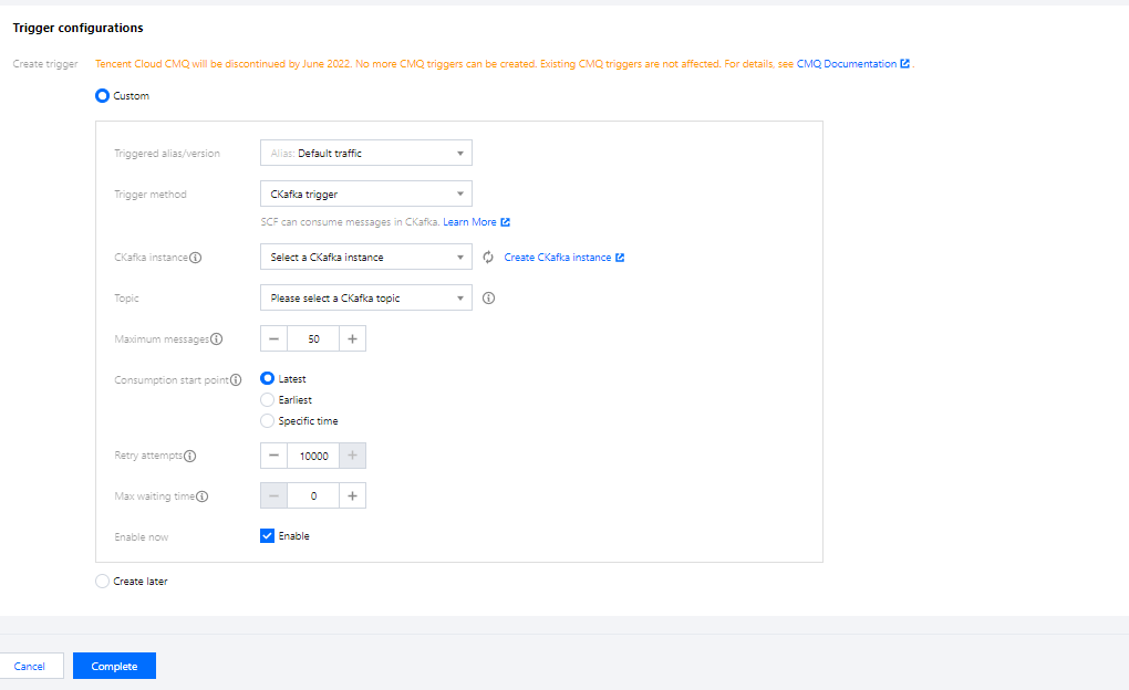 选择 Ckafka 触发器后,按照指引,配置消息来源的 Ckafka 实例的名称、主题等信息。您也可以选择 新建Ckafka。 注意: