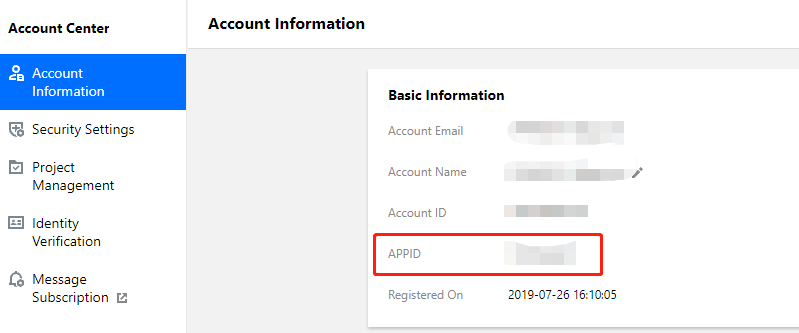 如果还未创建过密钥,请参见 创建密钥文档 生成新的 API 密钥;如果已创建过密钥,请参见 查看密钥文档 获取 API 密钥。 在控制台 账号信息 页面可以查看 APPID,如下图所示: