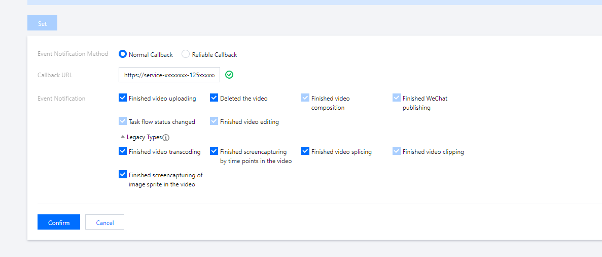 如 避免影响生产环境 一节所述,操作之前请先确认您的线上业务不依赖于 VOD 事件通知。 登录 云点播控制台,单击设置,回调模式选择普通回调,回调 URL 填写 步骤4 中获得的事件通知接收服务地址,回调事件全部勾选,然后单击确定。如下图所示: