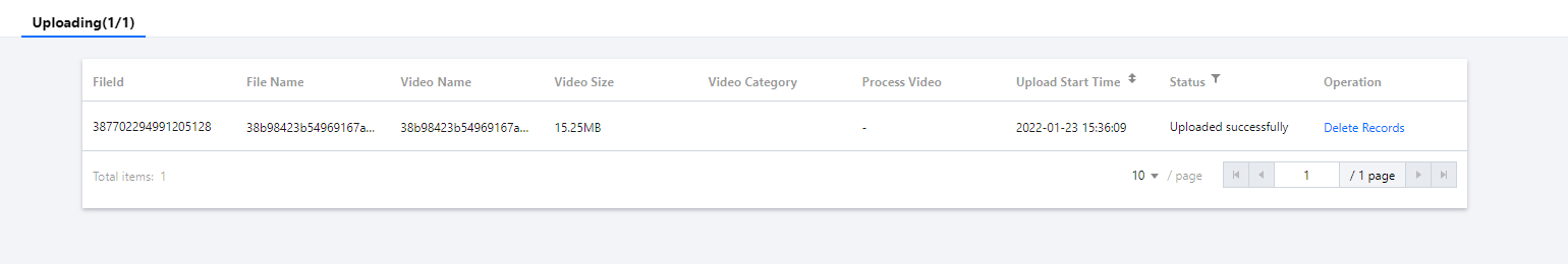 按照 上传视频 - 本地上传步骤 的说明,上传一个测试视频到云点播,注意上传过程选择默认的只上传,暂不进行视频处理。上传完成后,在“已上传”标签页可以看到该视频的状态为“处理中”,说明 Demo 接收到了 NewFileUpload 事件通知并发起了转码请求。