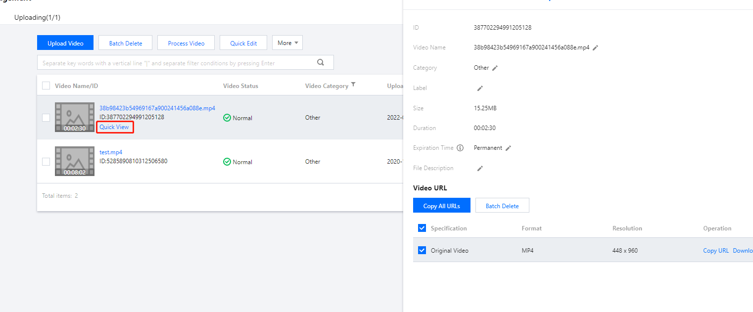 等待视频处理完成(状态变为“正常”)后,单击快捷查看,在页面右侧可以看到该视频有两个转码视频。如下图所示: