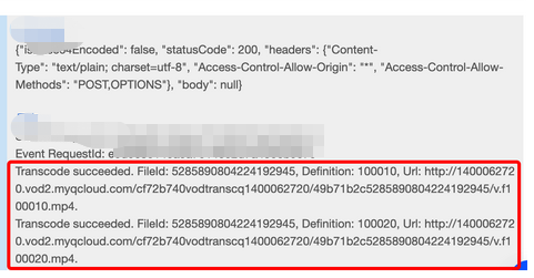 4. 调用trans_media()发起转码,输出云 API 的回包到 SCF 日志,并回包给 VOD 的事件通知服务: