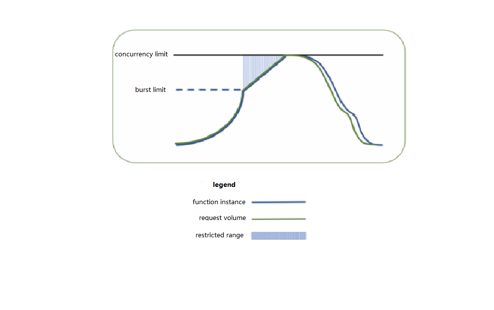 下图模拟了业务流量峰值时函数并发处理的具体场景。随着业务请求量不断增加,没有可用并发实例处理新的请求时,函数将启动新的并发实例进行扩容。当达到弹性并发的扩容速度限制时,函数扩容速度逐渐变慢,新的请求将会受到限制尝试重试。接着函数会继续扩容,最终达到函数区域对账户的并发限制。最终在满足业务需求后,请求量逐步减少,函数未使用的并发实例会逐步停止。