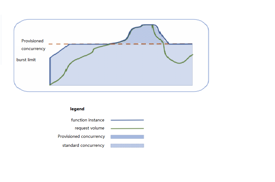 预置并发支持并发实例按配置预先启动,同时云函数平台不会主动回收这些实例,会尽可能地保障有相应数量的可以处理请求的并发实例。您可通过此功能,为函数的指定版本设定预置并发额度。通过配置预置并发,可预先进行计算资源的准备,降低冷启动、运行环境初始化及业务代码初始化引起的耗时。下图模拟了函数在处理业务流量峰值的预置并发的真实情况。