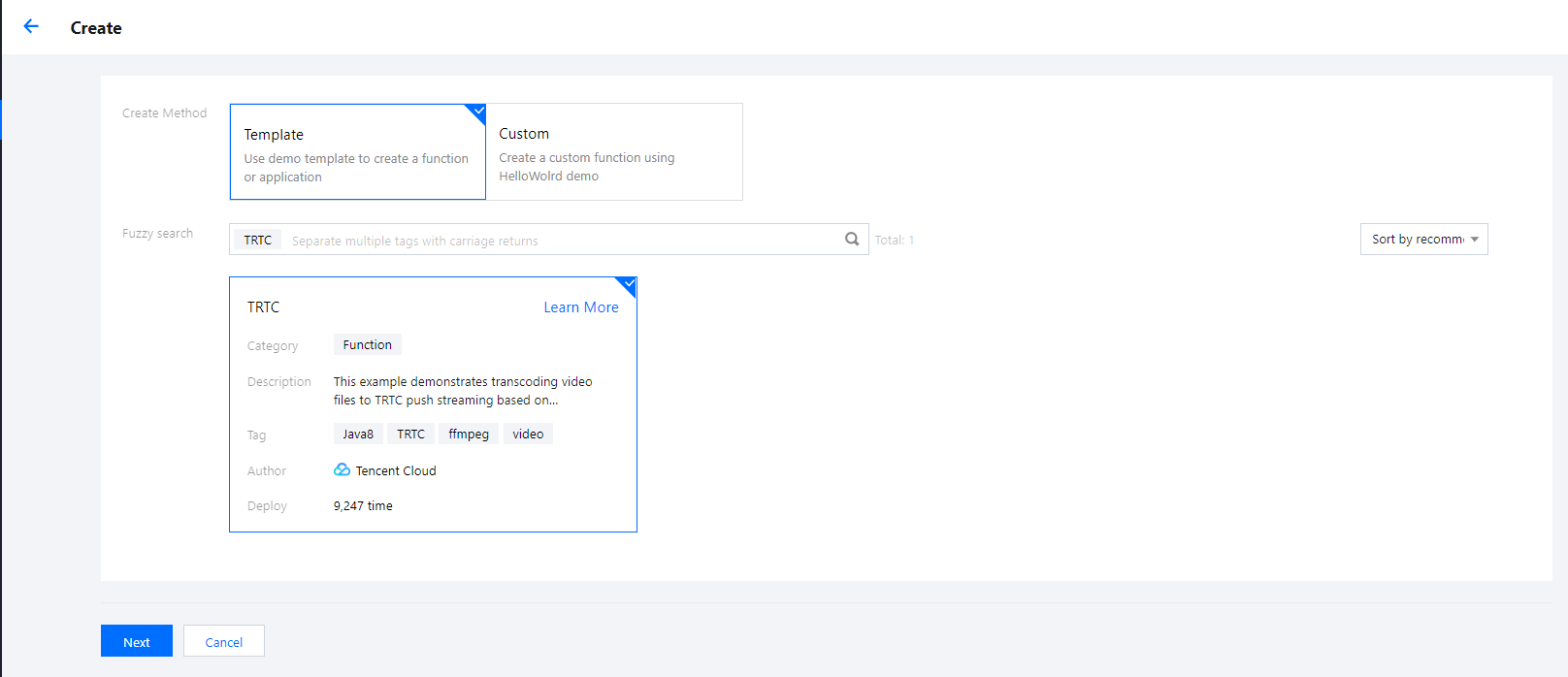 模糊搜索:输入“TRTC”进行搜索,选择单流音视频录制。