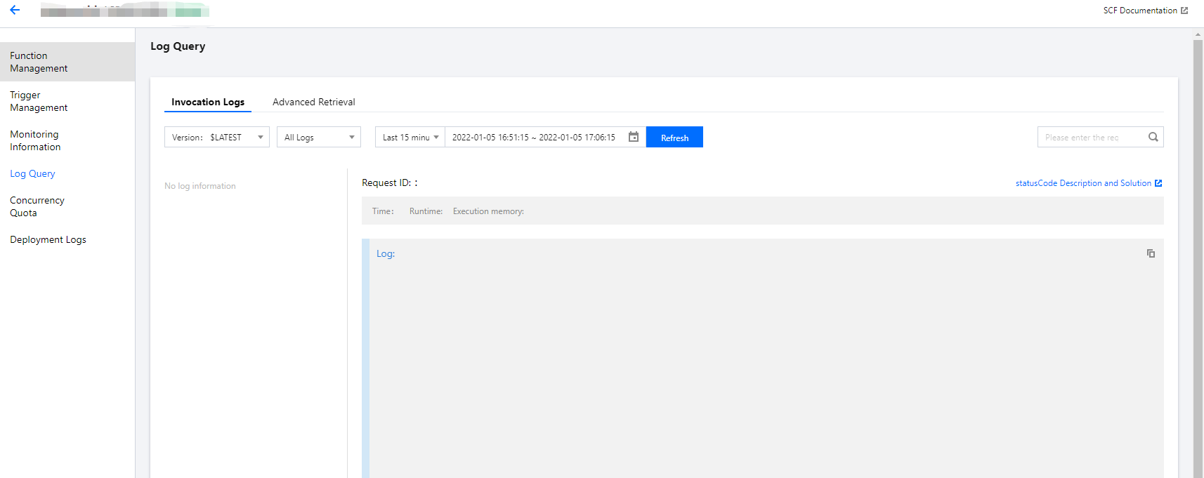 4. 在云函数控制台 函数服务页面中,单击上述 创建云函数 步骤中创建的云函数名称,进入“函数详情”页面。 5. 在“函数详情”页面中选择日志查询页签,可以查看到打印出的录制日志信息。如下图所示: