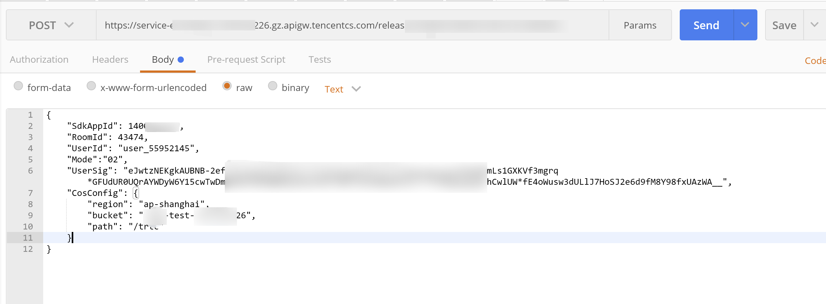2. 使用 Postman 构造 HTTP 请求。其中 roomId 为已创建 TRTC 应用的房间号,userId 为随机另一个用户 ID(必须唯一)。示例如下: