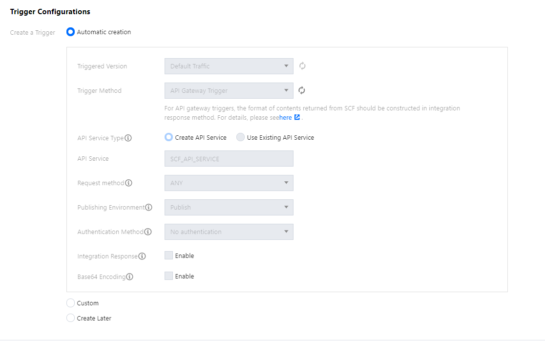 4. 配置 API 网关触发器,默认新建 API 服务,不开启集成响应。您也可以选择自定义创建,自定义创建时确保集成响应关闭。如下图所示: