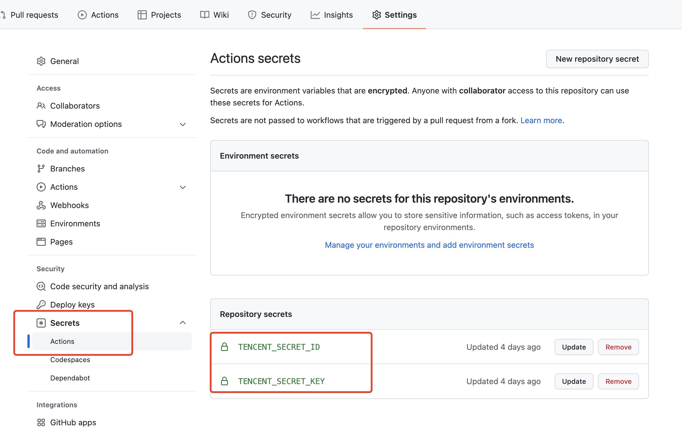 TENCENT_SECRET_ID 和 TENCENT_SECRET_KEY,您需要在 Github 代码仓库的设置中的 Secrets 里进行变量配置,如下图所示: