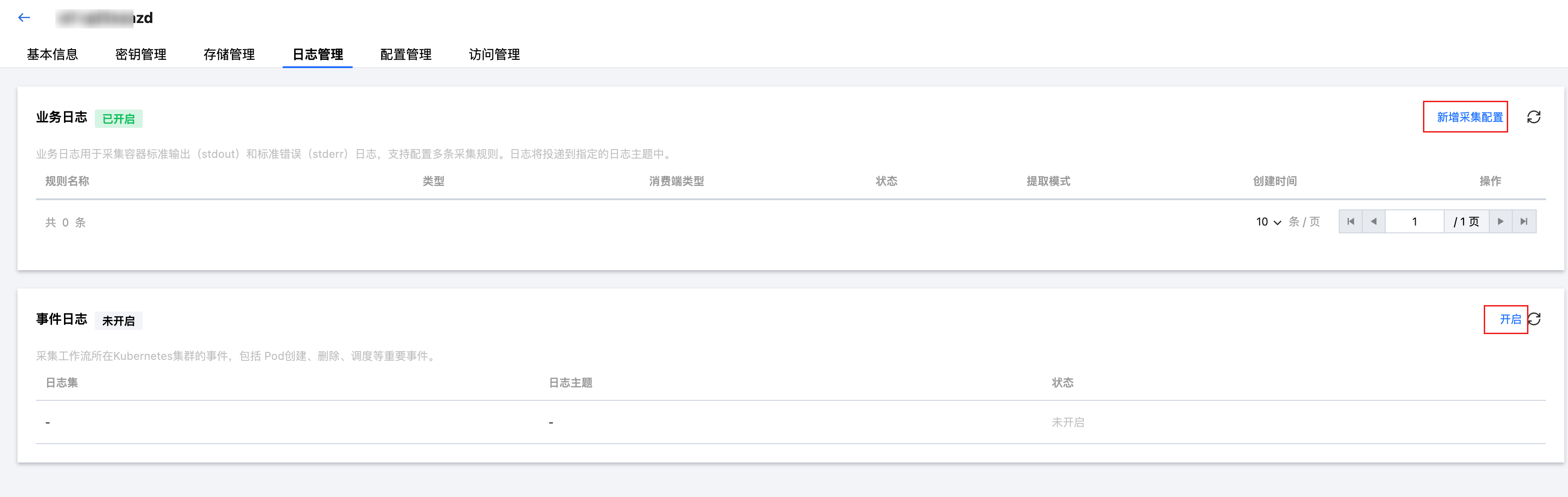 3. 选择日志管理,选择新增业务日志采集配置或者开启事件日志采集。如下图所示: