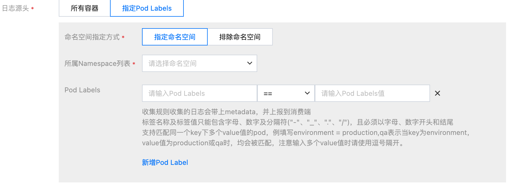 日志源支持所有容器、指定 Pod Labels 。如下图所示: