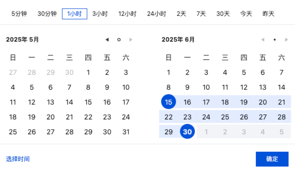 时间范围选择 | | 时间选择框,单击可选择图表展示的监控时间范围,默认选取近一小时内数据。 通过上方时间值可以快速选择指定时间区间。 通过日历可以选择大范围时间段。 通过左下角“选择时间”可以进一步选择精确到秒的时间范围。 |