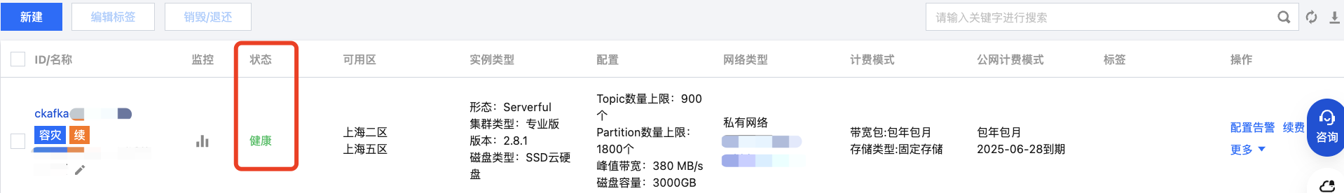CKafka 对每个实例均设置有巡检程序,巡检程序会检查该实例的连接数、磁盘使用百分比、生产峰值带宽、消费峰值带宽,当这些指标超过一定的阈值后会产生不同的健康状态。详细状态说明请参考监控指标及异常说明。 2. 左侧导航栏点击实例列表,选择好地域后,在集群列表的状态栏,可以查看集群的健康状况。若集群状态异常,您可以点击状态栏的浮标查看详细的提示信息。