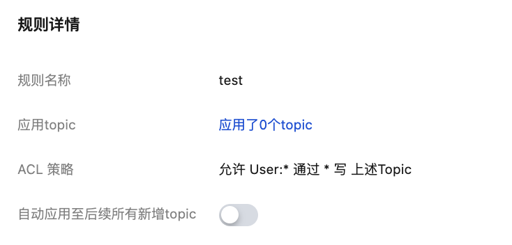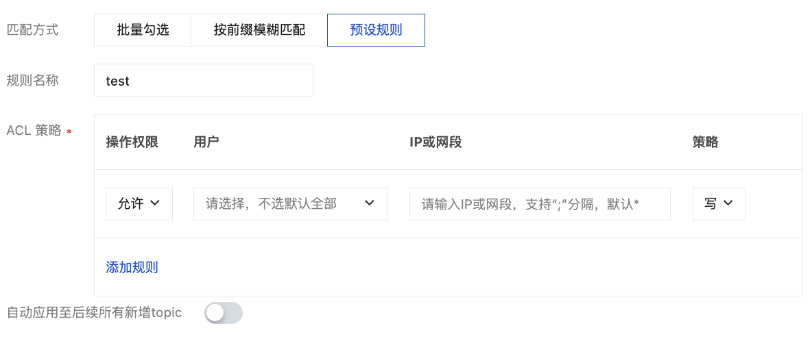 预设一套 ACL 策略,创建后,新建 Topic 时可以在高级参数设置中勾选配置该 ACL 策略。详情请参考创建 Topic。 规则名称:设置预设规则的名称,需符合命名规则,必须以字母开头,只能包含字母、数字、下划线、“-”、“.”。