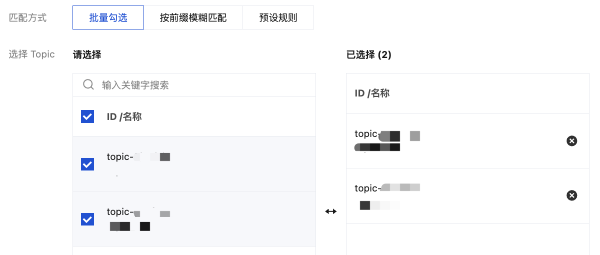 Kafka 2.4.1及以上版本的实例支持批量勾选、按前缀模糊匹配和预设规则三种方式选择生效 Topic,Kafka 2.4.1 以下版本实例仅支持批量勾选和预设规则两种方式。您可以通过以下页签查看不同匹配方式的配置说明: