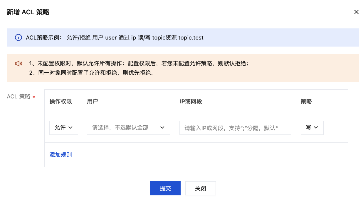 ACL 策略指为用户自定义的一组权限规则,允许/拒绝用户 user 通过 IP 读/写 Topic 资源。