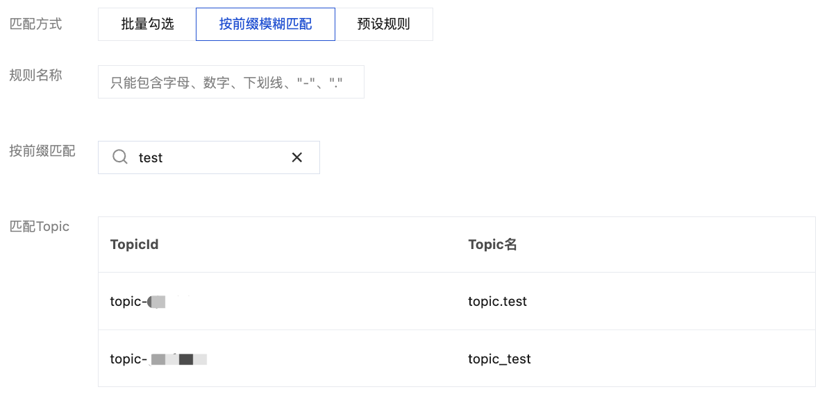 按前缀匹配:输入匹配字符,下方会自动展示匹配的 Topic 清单。