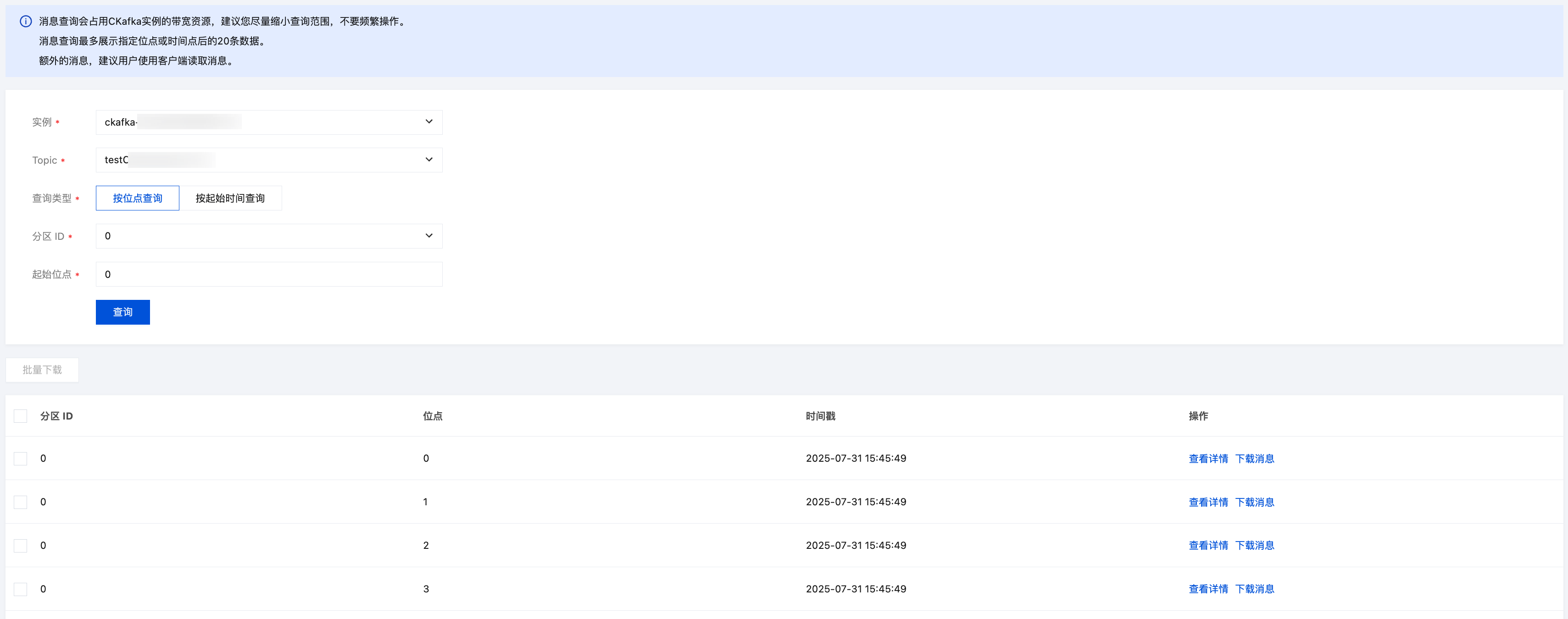单次查询最多展示起始时间或者起始位点之后的 20 条消息(如起始时间或者起始位点后消息不足 20 条则会全量展示)。