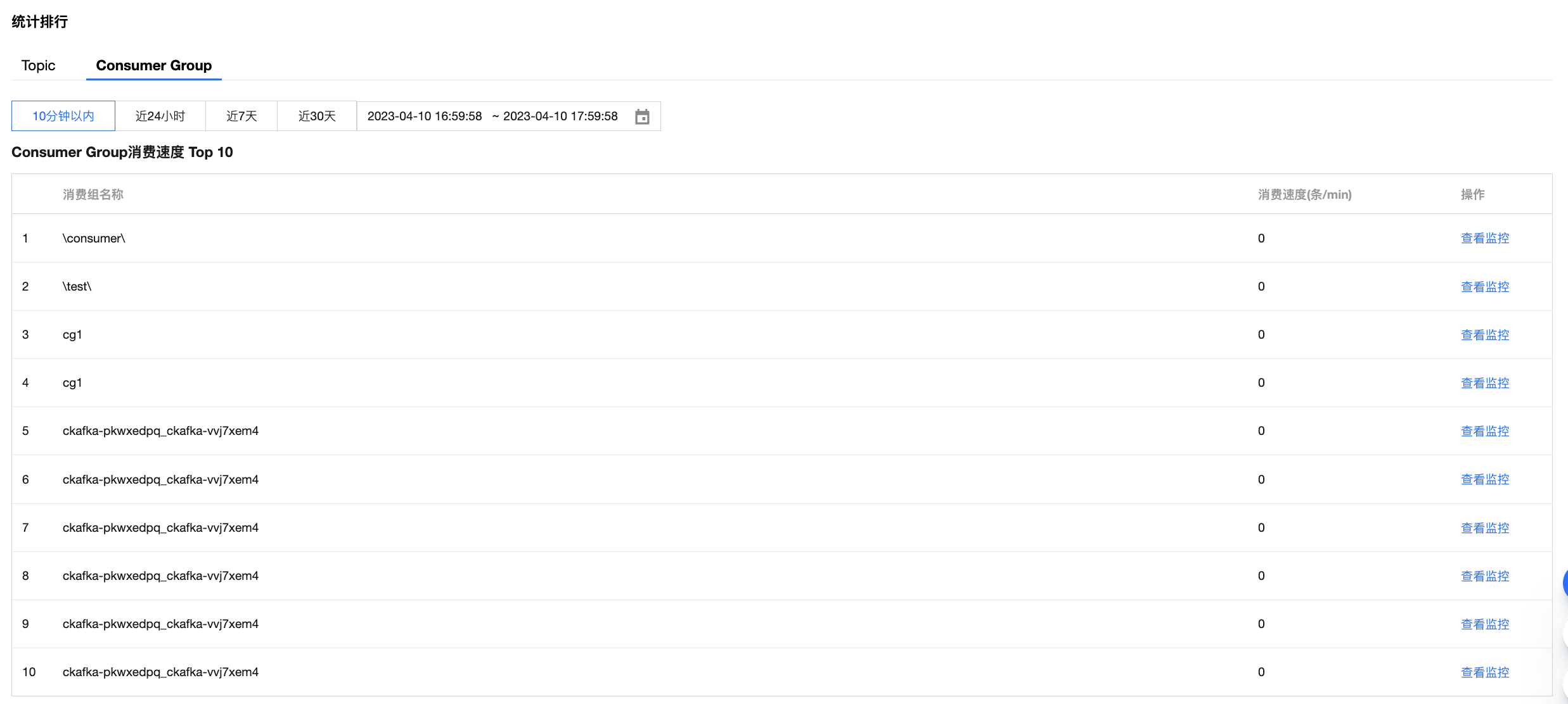 主题消费速度 | CtopicConsumerSpeed | Count/min | 当前主题所有分区消费组消费速率总和,按照所选择的时间粒度取和。 |