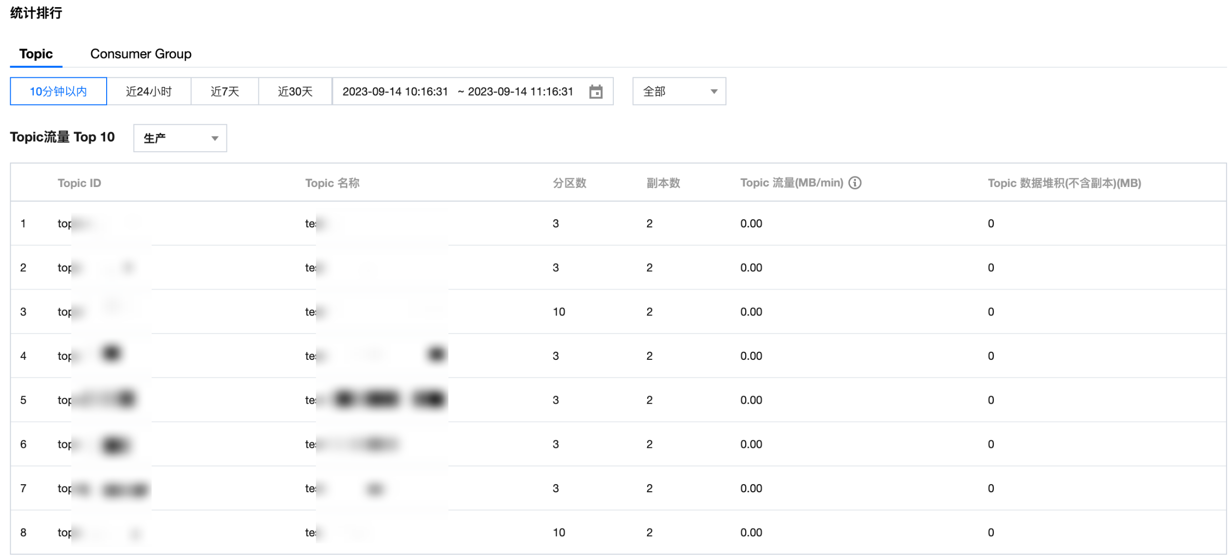 Topic 消费流量 | CtopicConFlow | MB | Topic 的实际消费流量(不包含副本产生的流量),按照所选择的时间粒度统计求和。 |