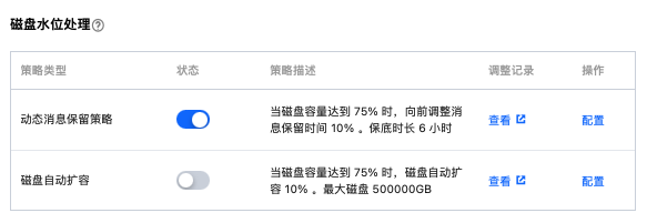 动态消息保留策略和磁盘自动扩容最多只能有一个开启。