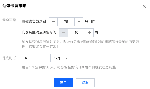 动态消息保留:用户设置消息保留时间后,过期的消息就会被删除。若遇到用户消息猛增的情况,磁盘空间满了之后,则无法正常生产和消费。设置数据动态保留策略后,当磁盘空间使用率到达一定的比例后,会自动向前过期一定比例的数据,避免上述情况出现。
