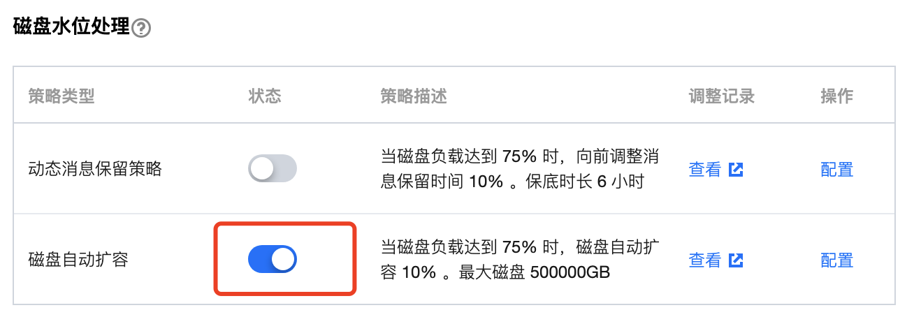 磁盘自动扩容:当磁盘负载过重之后,会无法正常生产和消费,设置磁盘自动扩容策略后,若磁盘负载到达触发阈值,会自动根据扩容策略调整磁盘容量,避免上述情况出现。