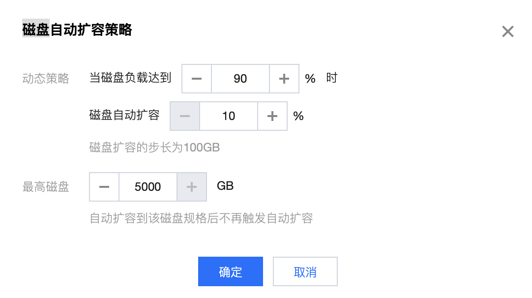 默认当磁盘负载达到 75% 时,磁盘自动扩容 10% 。最大磁盘是当前实例规格对应的磁盘上限,以控制台展示为准。