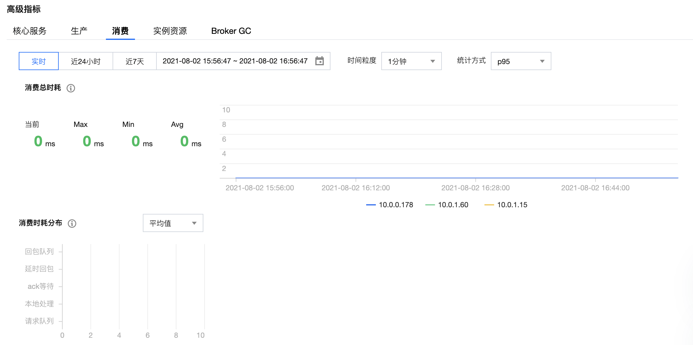 如果想确认是否是服务端问题,可以在控制台查看高级监控里面的消费耗时,耗时信息表示服务端处理请求的耗时,如果服务端负载有问题,可以看到统计各阶段耗时较高,如下图: