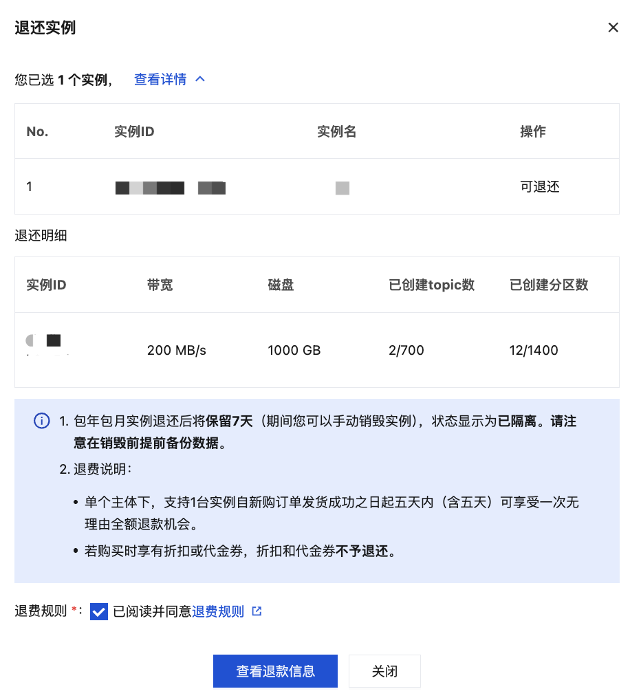 4. 在退还实例的弹窗中确认好退还的资源明细,并阅读退费规则后,单击查看退款信息。