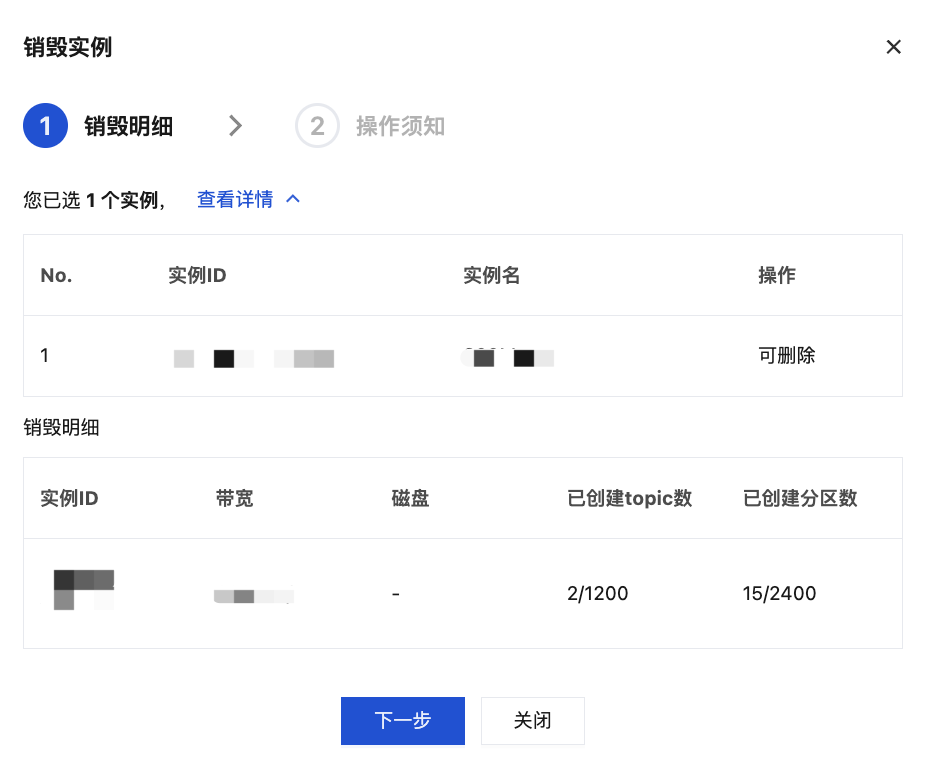 4. 在销毁实例的弹窗中确认好销毁明细后,单击下一步,在确认销毁的弹窗中单击确认销毁,即可销毁该实例。